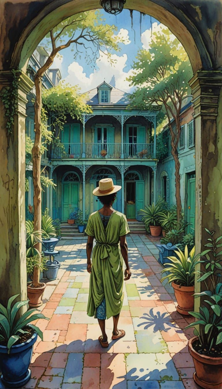 This image shows a sunny courtyard scene in the French Quarter, rendered with watercolor and gouache techniques. The artwork features pastel indigo and mossy green hues.