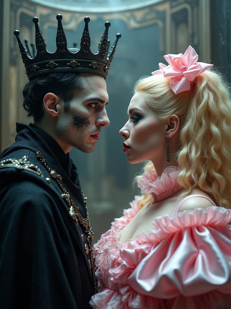 This haunting portrait depicts a ghostly king in dark regalia, transfixed by a beautiful bride in a whimsical, Victorian-inspired wedding dress, amidst a striking contrast of light and shadow.