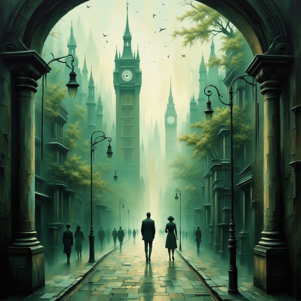 A photorealistic wide-angle view of ancient Westminster streets shrouded in mist, rendered with cinematic golden hour lighting and a shallow depth of field.