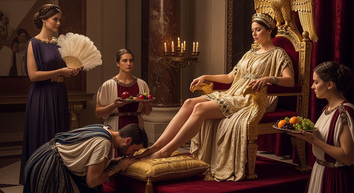 This image shows a Roman Empress in a gold toga, reclining on an elaborate eagle throne in a palace. Ambassadors kneel before her as servants attend to her needs in this photograph with natural lighting and sharp focus.