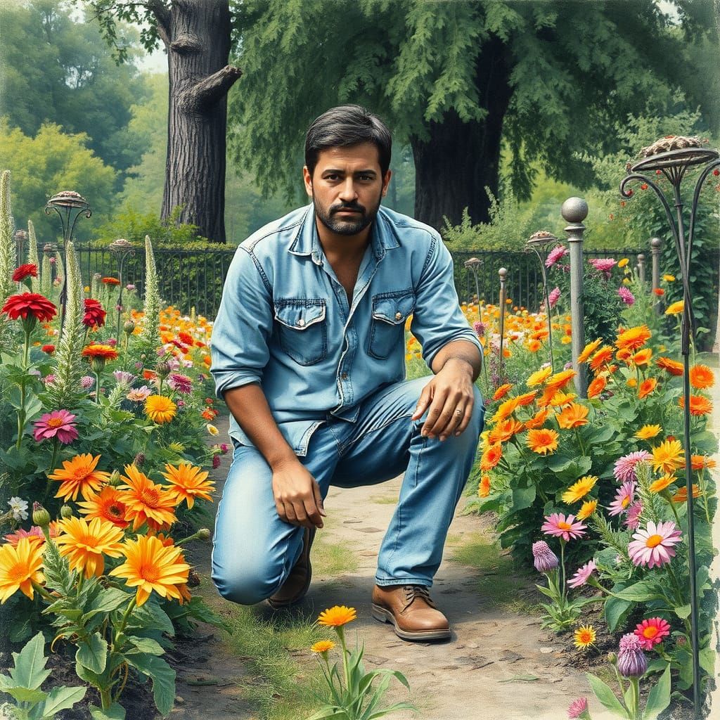 A detailed charcoal drawing of a gardener tending a lush garden. The artwork features textured brushstrokes with elements of impressionism, using impasto layers and matte painting techniques.