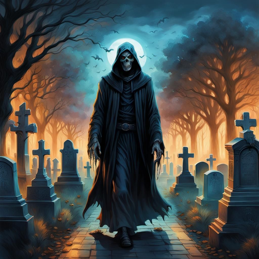 A hyperrealistic image of a grim reaper walking through a cemetery as ghosts and hands emerge from graves. Dramatic lighting, warm and cool tones, and vibrant colors create an eerie, dreamlike atmosphere.