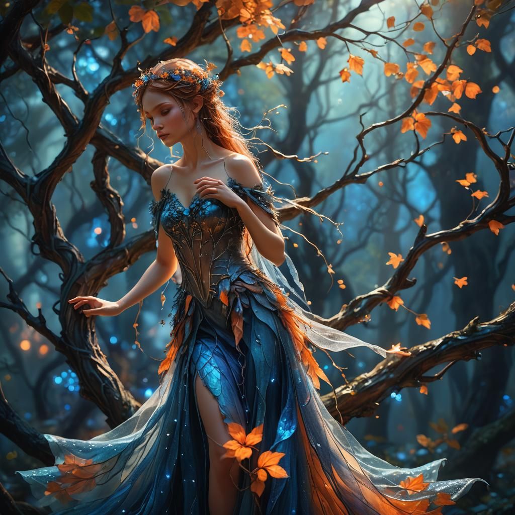 This image shows a delicate fairy in a flowing gown, leaning against a gnarled branch, rendered as hyper-realistic matte painting with intricate details. Blue and orange light create a vibrant scene, with soft, cinematic lighting.