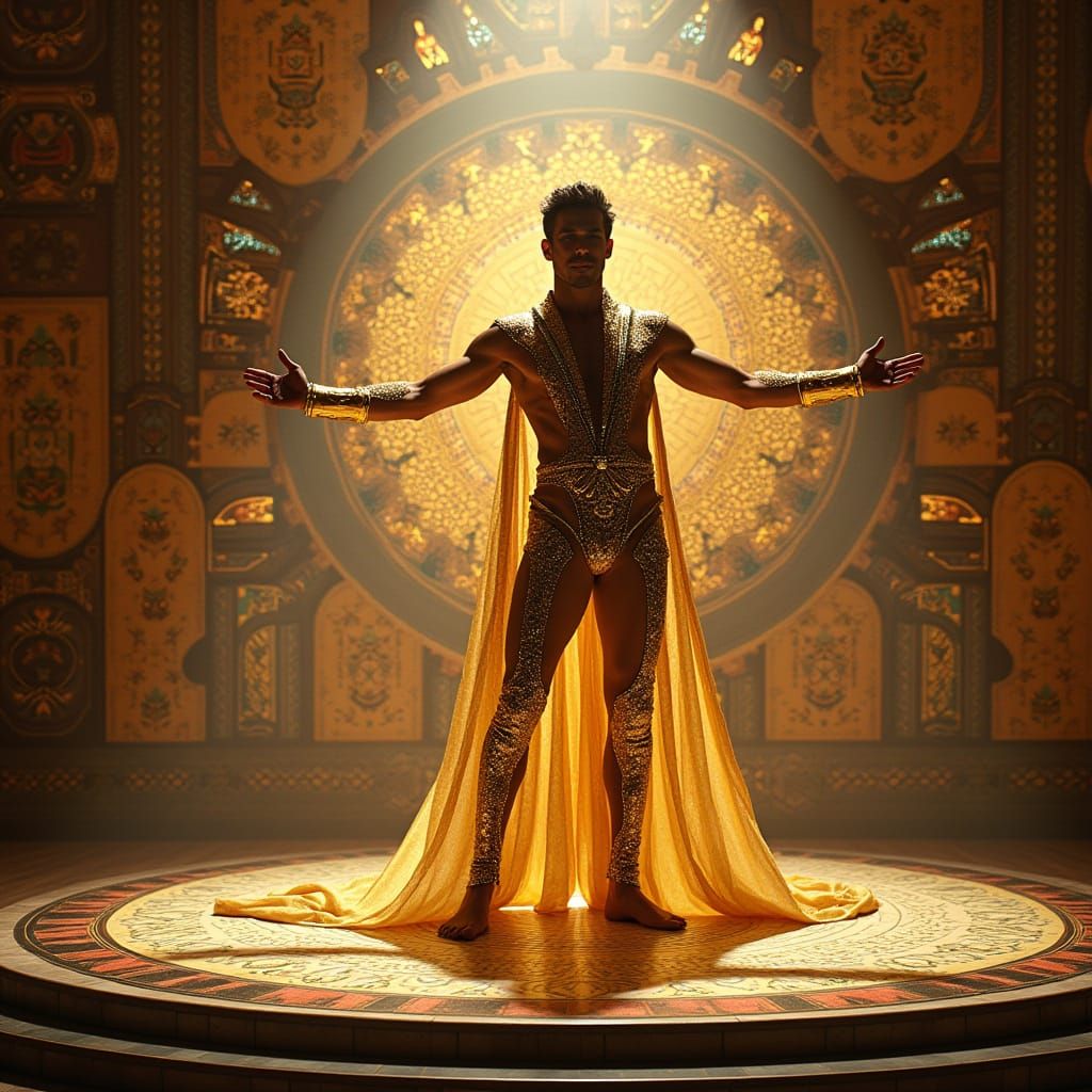 A digital art piece depicting a pop star on a grand stage. The artwork blends classical Byzantine mosaic elements with a contemporary style, featuring vibrant colors and art deco elegance.