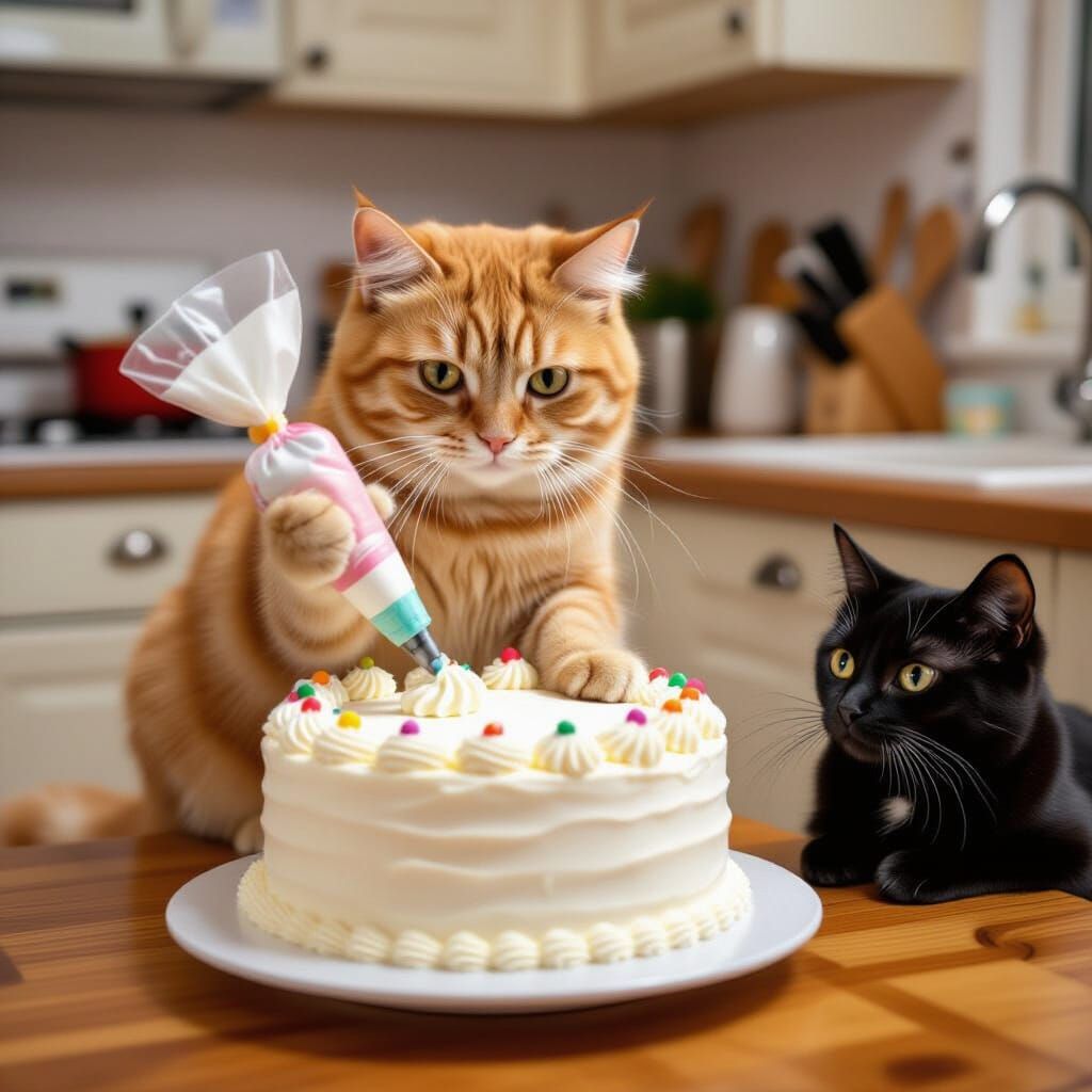 This image shows an orange cat expertly decorating a birthday cake with a pastry bag, while a black cat curiously peeks from the table's edge.