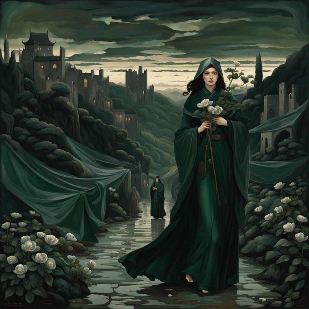 A haunting image of a lone woman in xianxia robes, walking through a desolate town at dusk, surrounded by dark green silk banners and lush foliage, as captured in a Pre-Raphaelite style with muted, earthy tones.