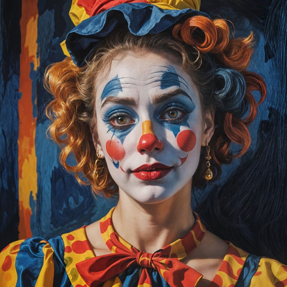 This image shows a very attractive woman dressed as a clown striking a pose. The mysterious makeup enhances her beauty in this stylized portrait.