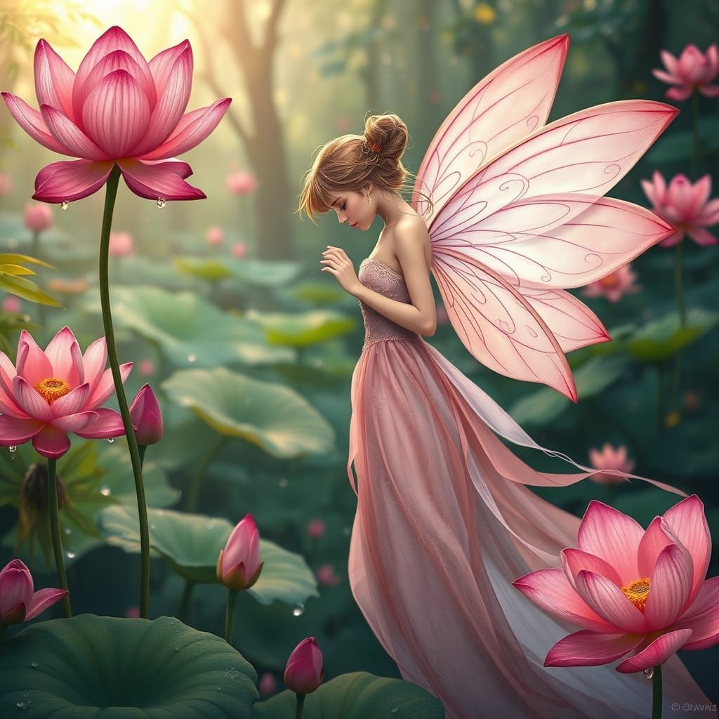This image shows a delicate fairy surrounded by a lush, vibrant forest, holding a majestic lotus flower with golden undertones. The fairy's wings and gown shimmer with iridescent colors, set amidst a warm, soft light reminiscent of fantasy art.