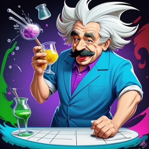 A whimsical cartoon caricature of Albert Einstein with exaggerated, gravity-defying hair, playfully sticking out his tongue. Features include a chaotic lab and vibrant, saturated colors in a classic animation style.