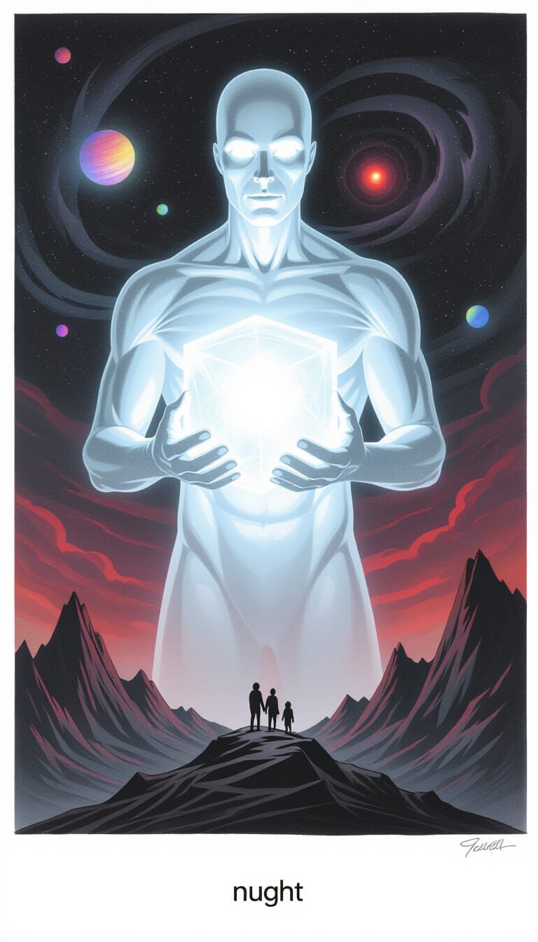 This charcoal drawing depicts a giant luminous figure with glowing eyes and smooth skin holding a radiant cuboid. Small figures gaze up from a dark, alien mountain range under a cosmic sky.
