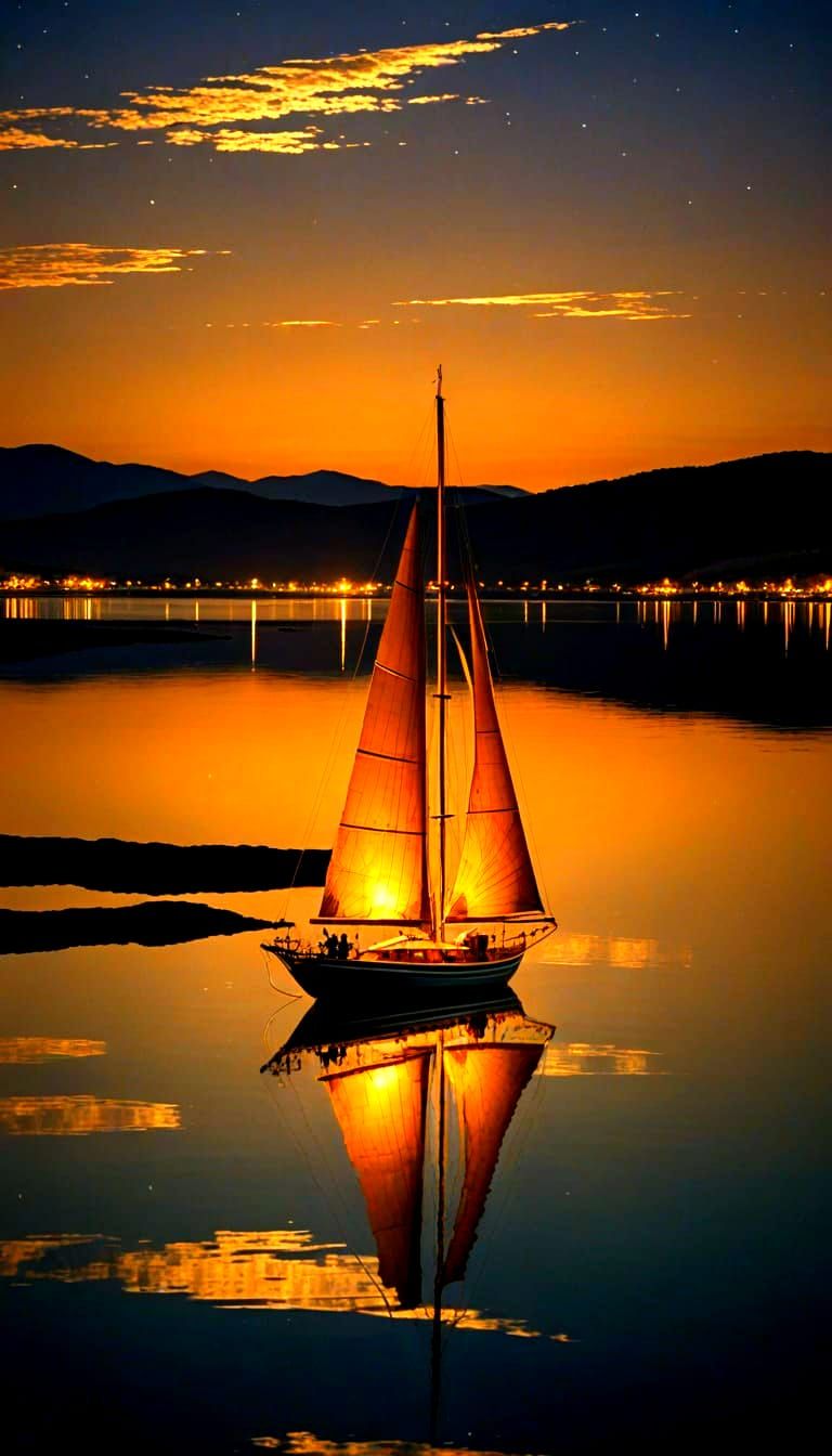 This image shows a wooden sailboat mirrored in a golden ocean at night. The artwork captures a serene nautical scene with a reflective surface and warm color palette.