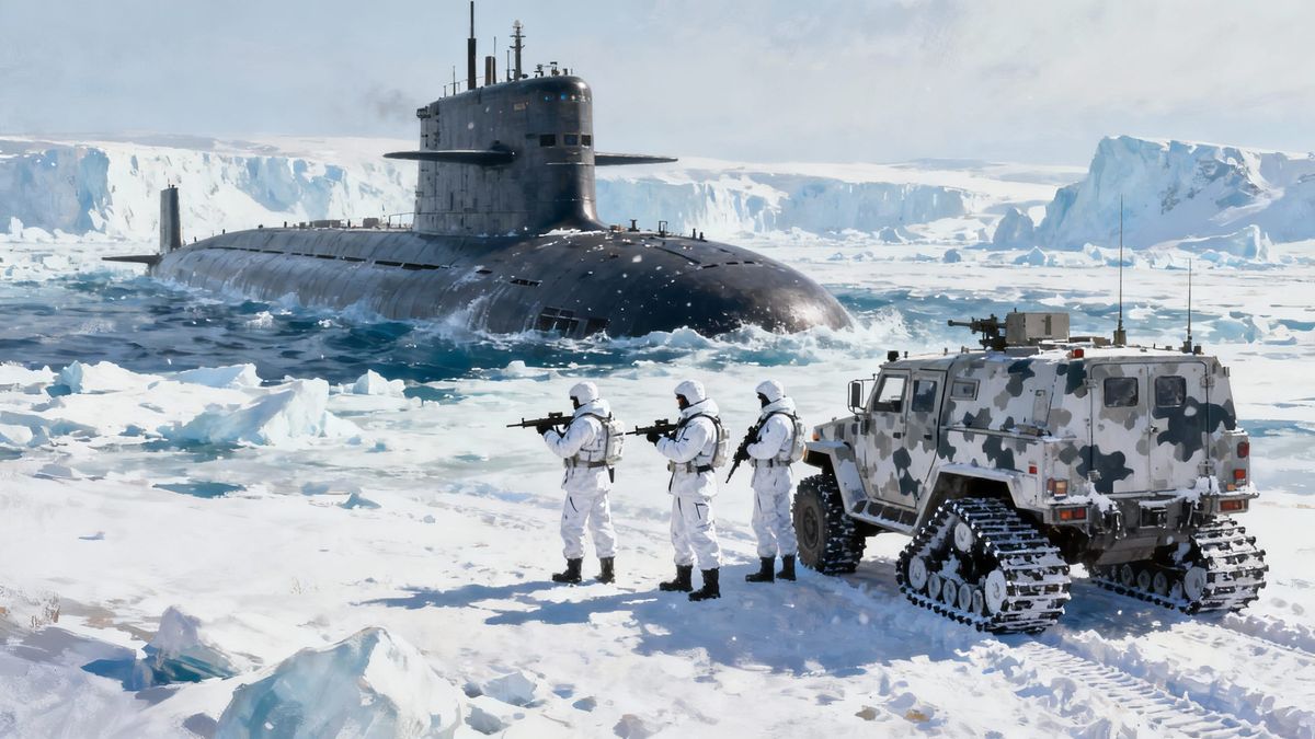 A hyperrealistic digital painting shows a massive submarine surfacing through Arctic ice. Elite soldiers in white gear and snow vehicles await in the harsh, cold landscape with stark, natural lighting.