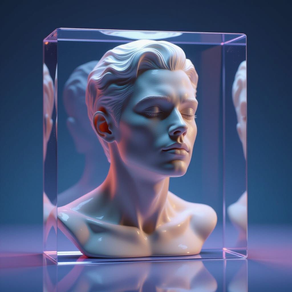 A striking picture of a hyperrealistic ceramic sculpture of a human figure in motion. The sculpture is encased in translucent epoxy resin with dramatic lighting and a vibrant, colorful backdrop. The aesthetic is futuristic and highly detailed.