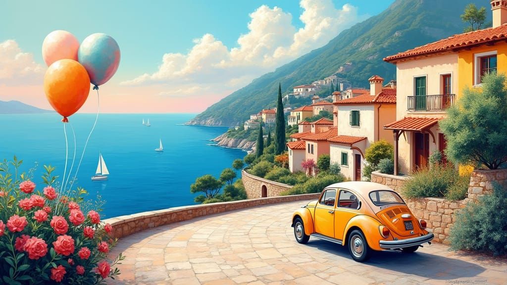 A vibrant gouache painting of a Mediterranean village at sunset. The naïve art style features impasto textures, pastel flowers, red tile roofs, and a classic car with wedding balloons.