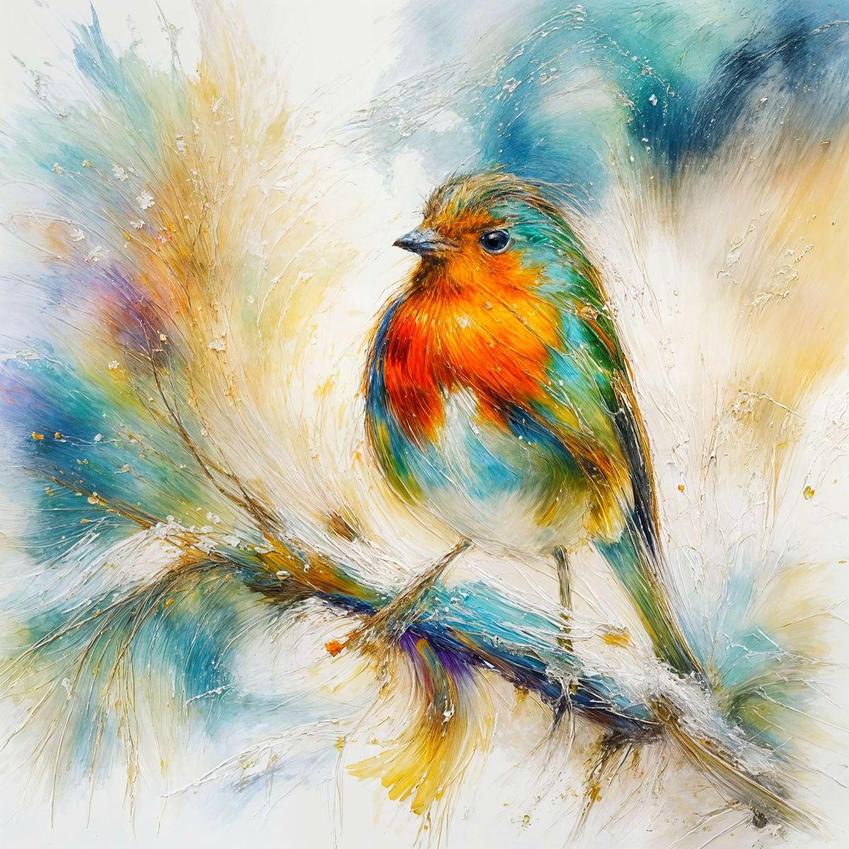 A tiny robin seeks shelter from a snowstorm on a snowy branch. This artwork features a stylised watercolour aesthetic with dynamic splashes of white.