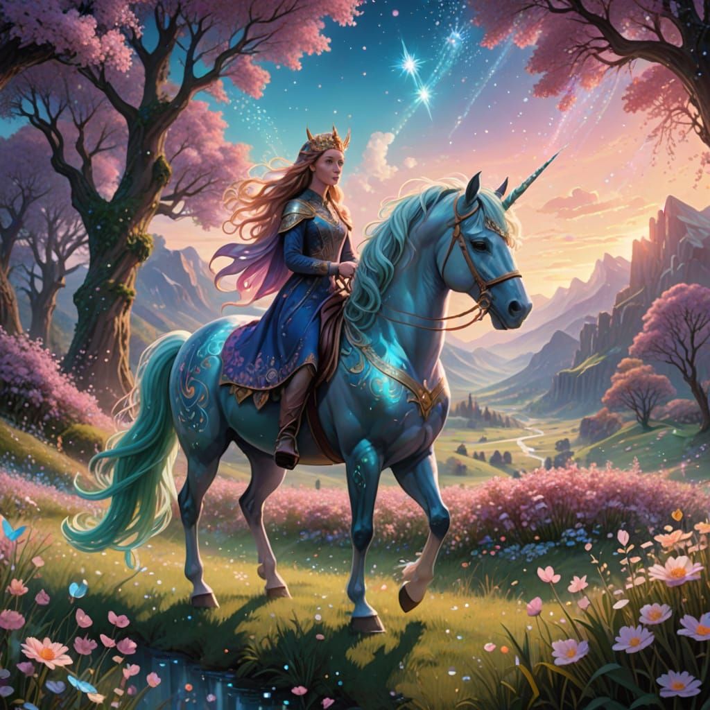 This image shows an alicorn and enchantress riding through an enchanted valley. The dreamy pastel art features sparkling gemstones, iridescent petals, and an ethereal glowing landscape.