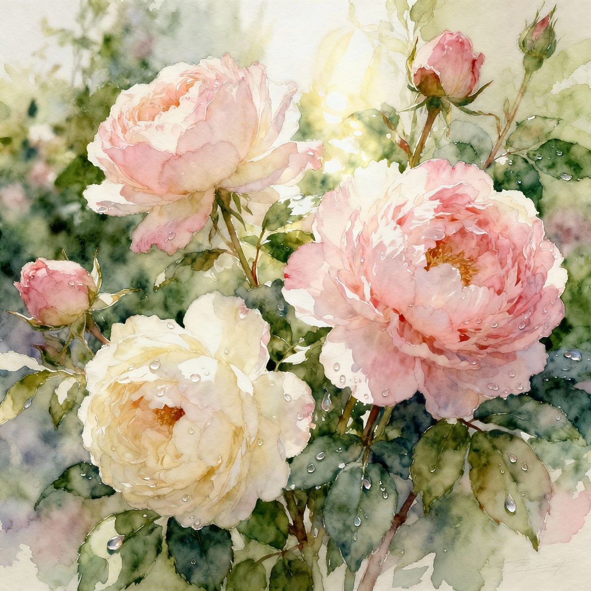 A romantic watercolor painting featuring roses and peonies with soft pink and cream colors. The delicate wet-on-wet technique creates translucent petals, evoking garden freshness.