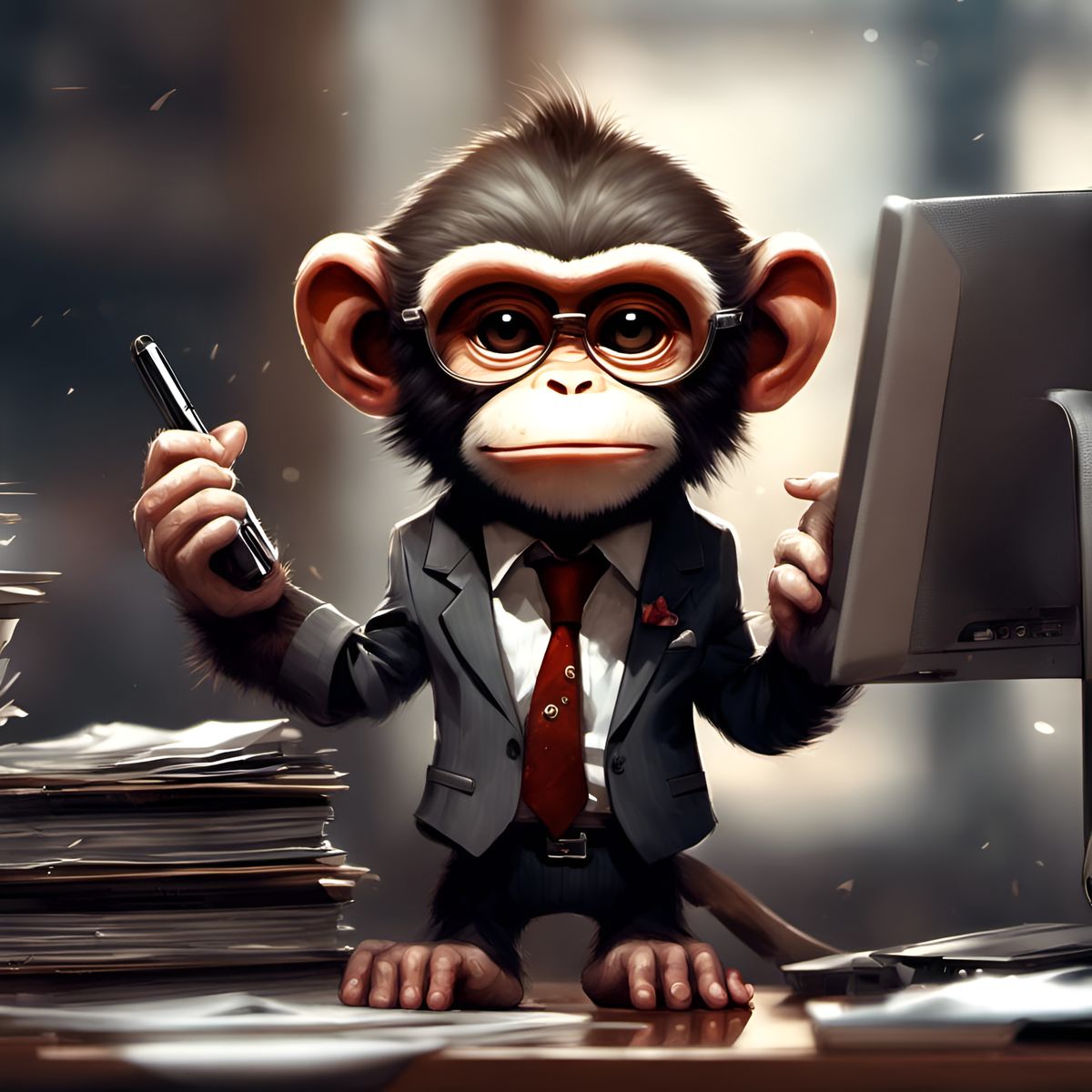This image shows an adorable, grumpy monkey in a business suit inside an office. The 3D rendered digital art features extreme detail, intricate motifs, bright lighting, and a deep depth of field.