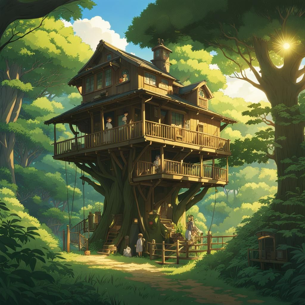 This image shows an animal family living in a treehouse. The scene is rendered in a Studio Ghibli anime style with deep colors, intricate details, and natural lighting.