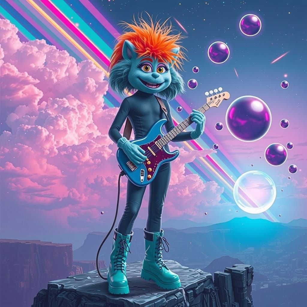 A vibrant image of a light blue, muppet-like queen with neon orange hair holding an electric bass guitar. Set on a high cliff amid pink clouds, rainbow streaks and neon orbs, in a dynamic, futuristic aesthetic.