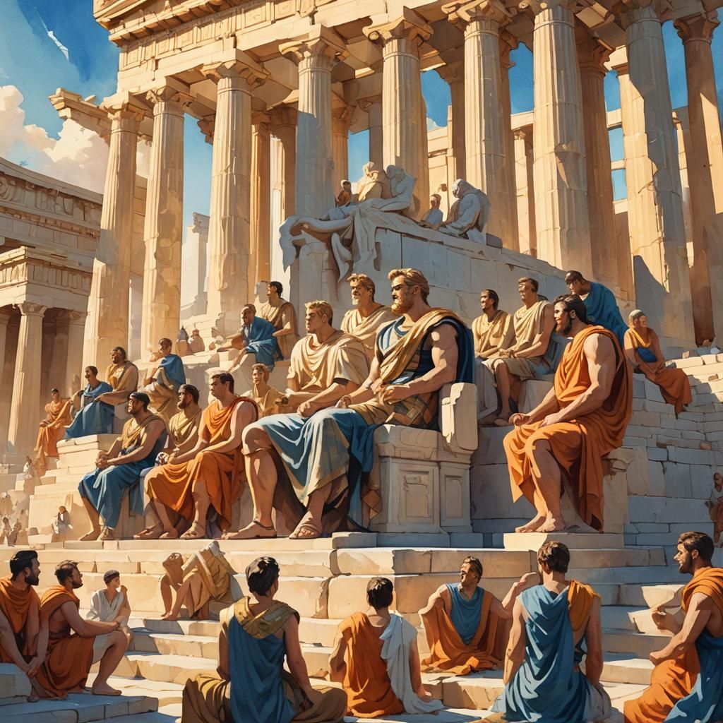 A vibrant image of ancient Athens in a high fantasy setting. Toga-clad citizens gather at the base of the Parthenon as Olympian gods look down from the sky in watercolor style.