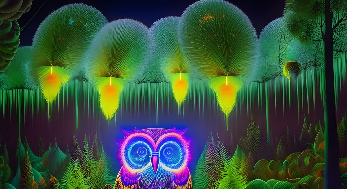 A vibrant image of a bioluminescent owl in a surreal forest. The artwork uses psychedelic colors and neon glows to create an expansive, intricate scene in a maximalist style.