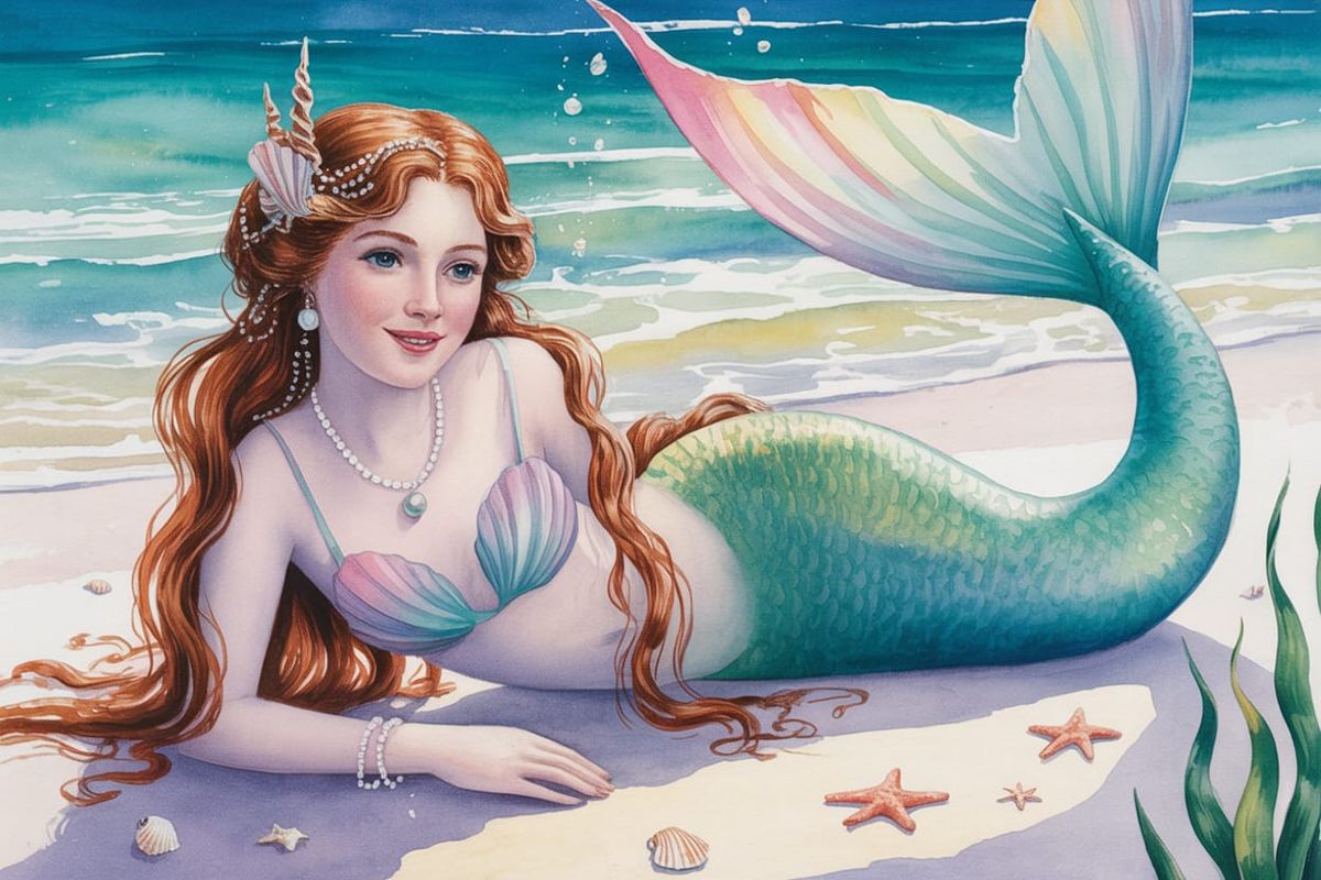 This image shows a watercolor painting of a mermaid with pale skin on a beach. The turquoise tail shimmers in sunlight, creating a dreamlike scene in a watercolor aesthetic.