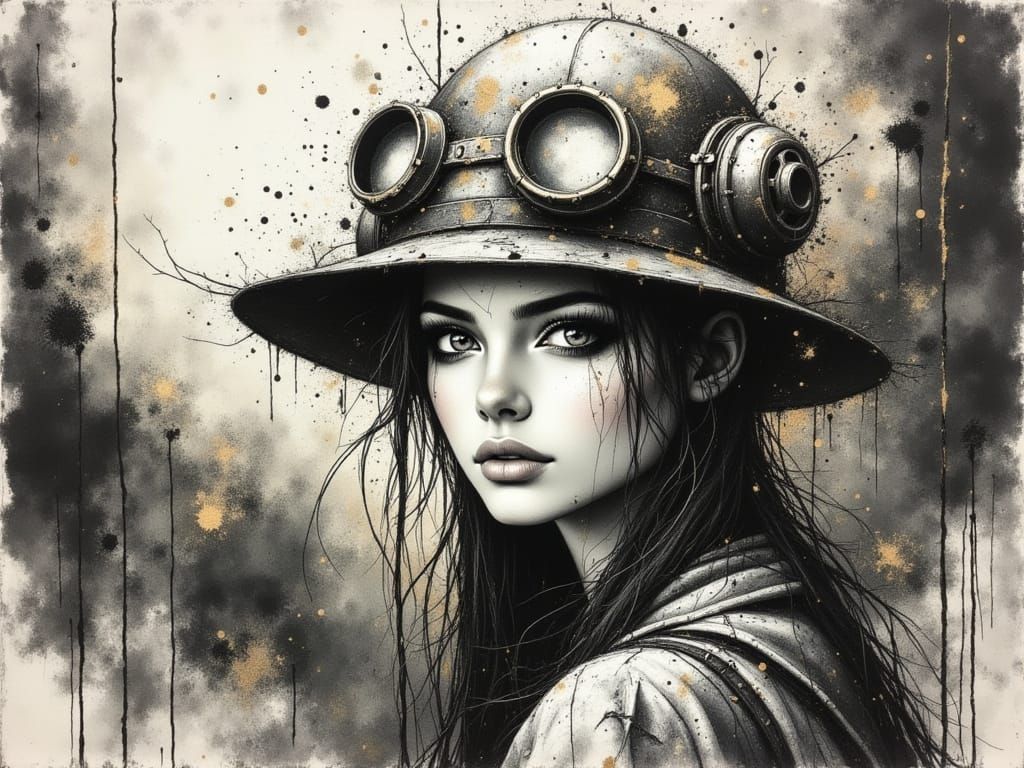 A charcoal illustration of a woman in a steampunk fantasy style. The image features gold elements and has a divine, oil-painting-like quality.