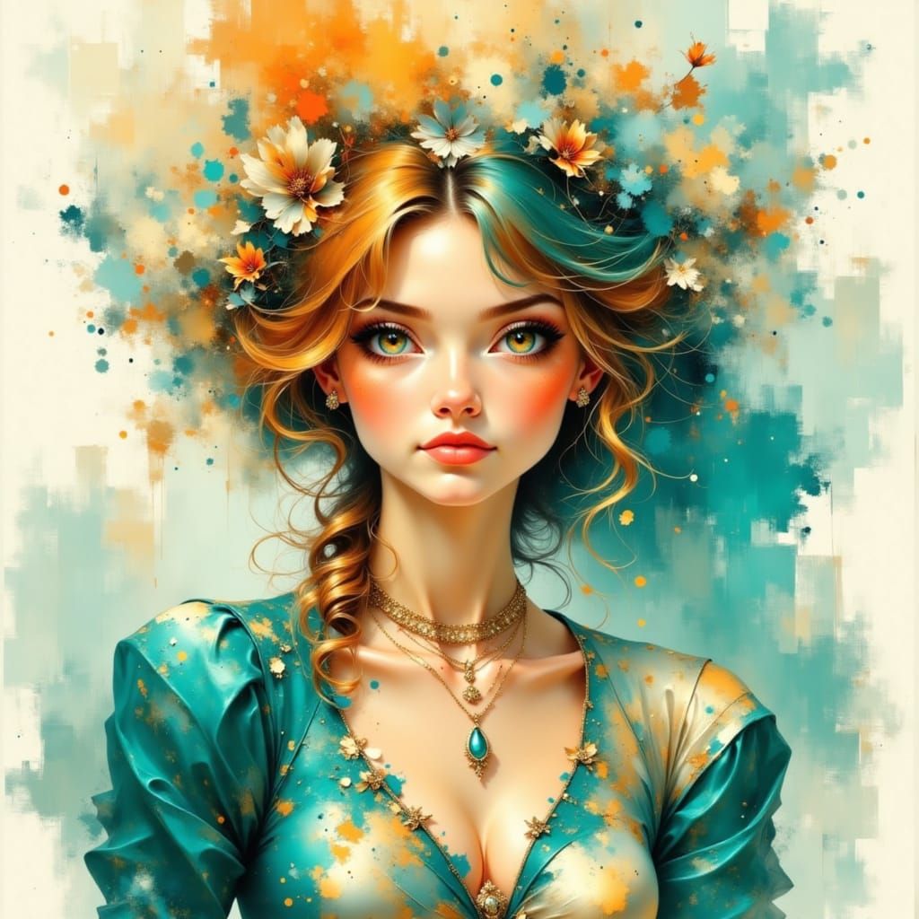 This image features a stylish young woman on a yacht, rendered in a fashion illustration style with vibrant amber, ruby, and teal accents.