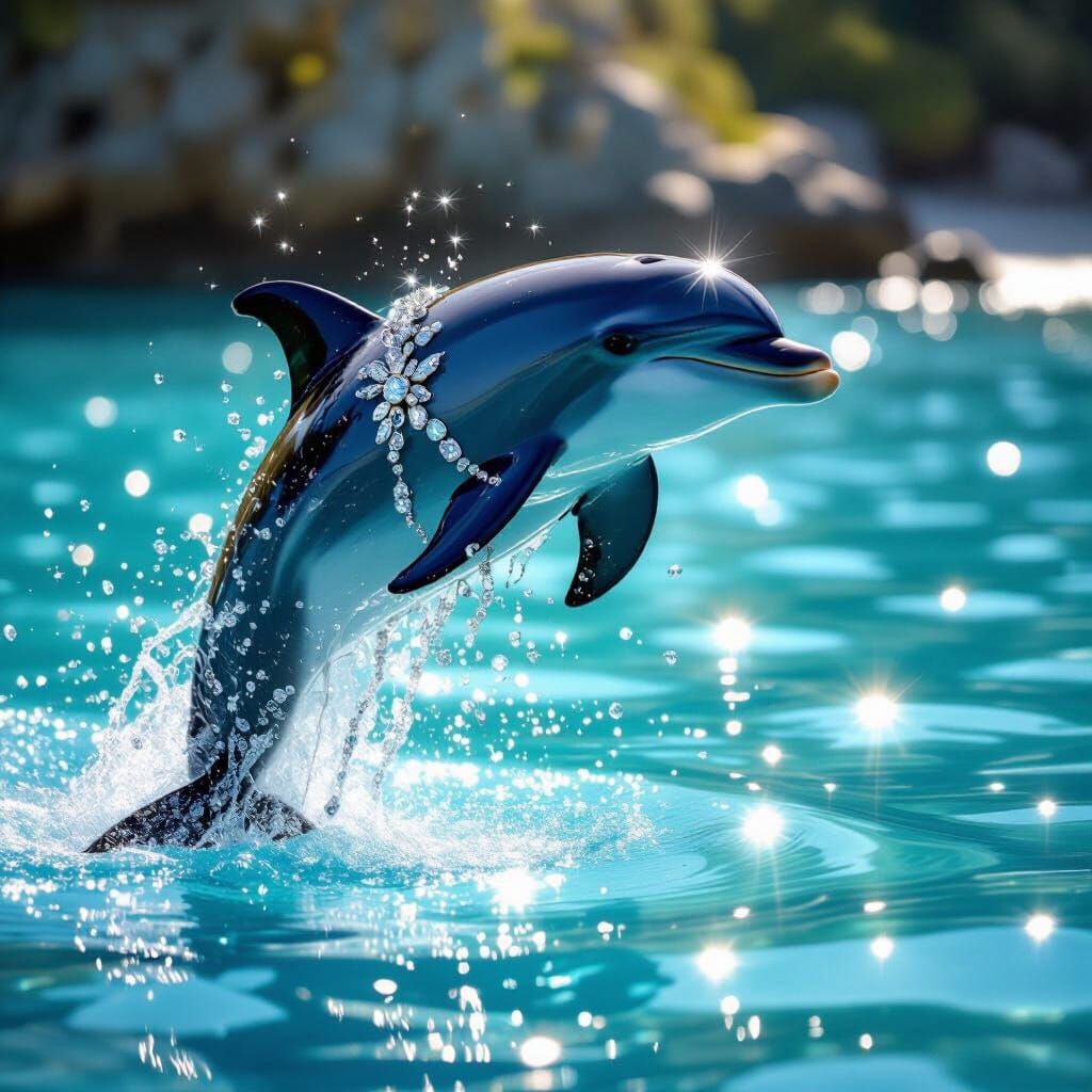 This image shows a dolphin leaping from a clear blue ocean, wearing sparkling crystal jewelry. Captured in a vibrant, photorealistic style with dramatic lighting.