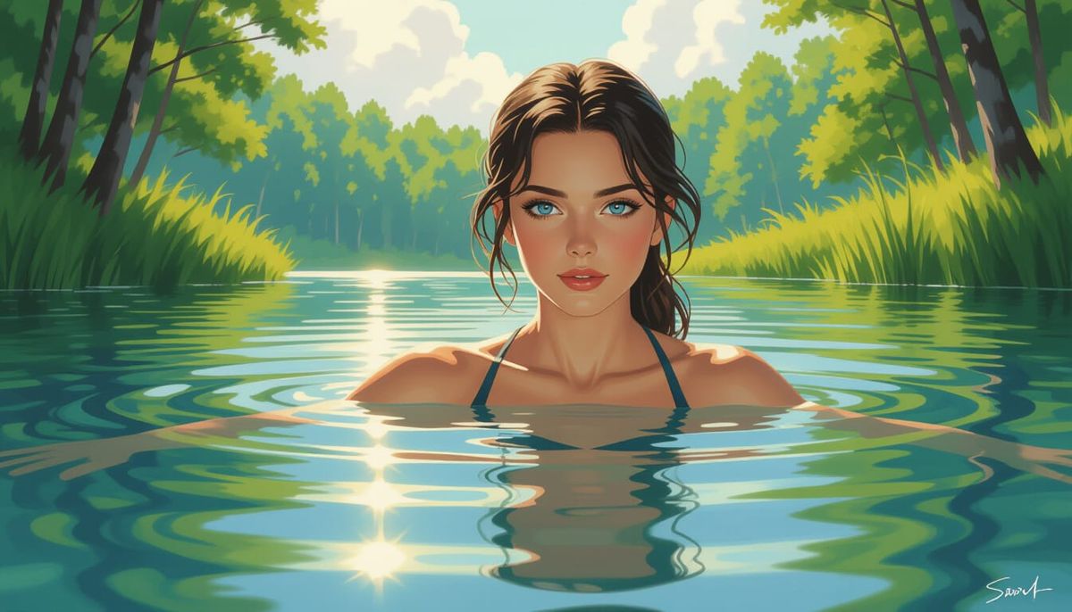 This image shows a woman swimming in a lake with lush greenery. Sunlight creates ripples on the water, rendered with hyper-realistic details.
