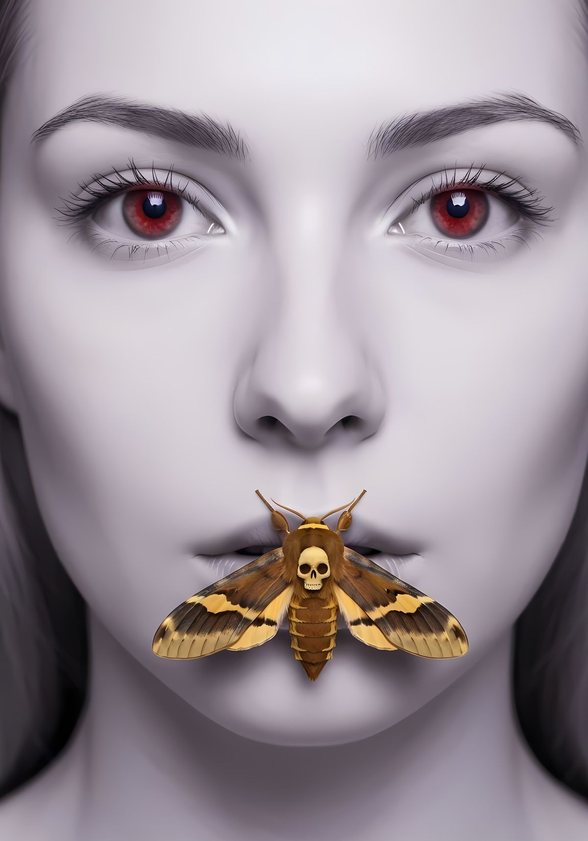 A striking close-up of a woman's face in grayscale, featuring a death's-head moth covering her mouth. Soft lighting and a neutral gaze enhance the symbolic, unsettling contrast between skin and moth.