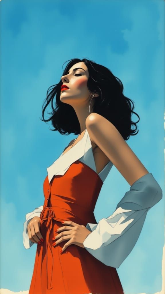 This image features a portrait of a woman set against a vibrant azure sky. The artwork evokes a sense of Parisian style and incorporates striking blue tones.