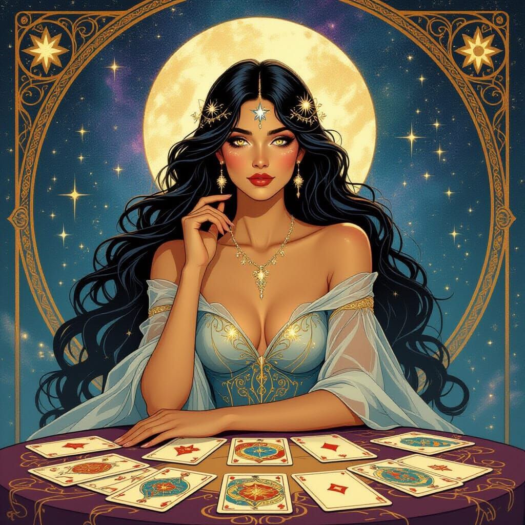 A digital painting of a fortune teller surrounded by cosmic elements. The artwork evokes art nouveau with ethereal beauty and soft lighting, reminiscent of illustrative and atmospheric digital art.