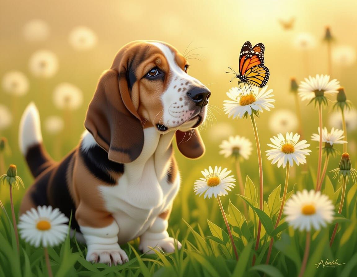 Cute Basset Hound and a Butterfly Surrounded by White Daisies