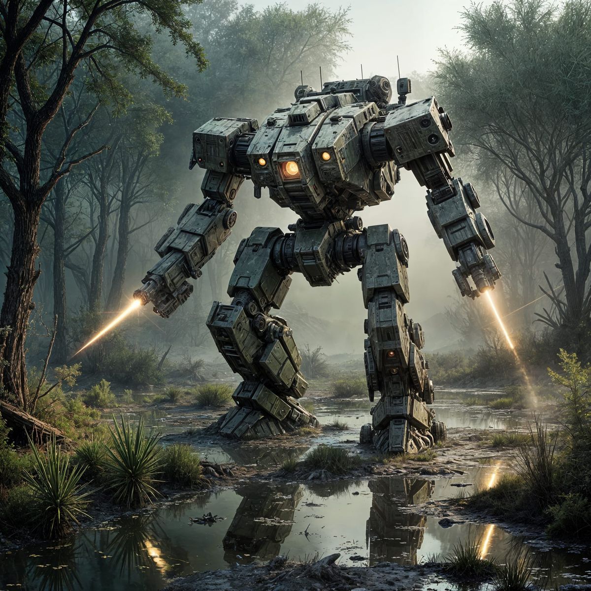 A heavily armored, angular Battlemech with laser arms rises from a murky swamp. Its green pulse lasers reflect on the water just before dawn in a cinematic, photorealistic style.