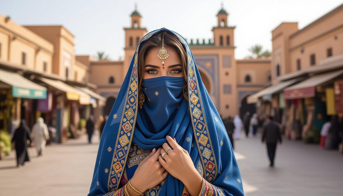 This hyperrealistic image shows a beautiful Moroccan woman with a Tifinagh tattoo, her eyes glowing from behind a jewel-adorned blue veil. She stands before a luxurious wooden portal in Marrakech, with desert-style golden architecture. Rendered with vibrant colors and dramatic lighting.
