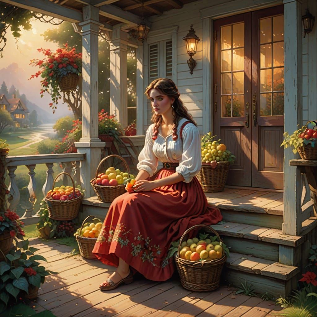 A nostalgic image of a girl sitting on a porch with a fruit basket. The artwork evokes a soft, dreamlike atmosphere with warm lighting and vivid colors, reminiscent of idyllic landscape paintings.