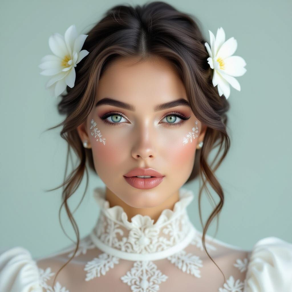 A striking picture of a light-skinned cyborg woman with short dark hair. She has intricate silver and white makeup resembling branches and leaves, and a mechanical arm with white and gold plating.