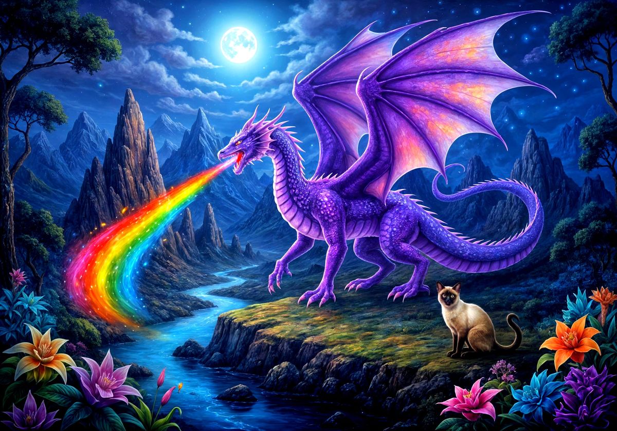 This highly detailed painting features a glowing, iridescent purple dragon with two wings, breathing vibrant rainbow fire. The magical landscape includes mountains, a river, and flowers under the moon.