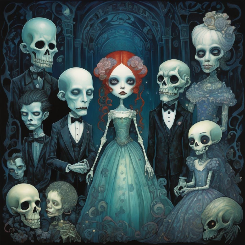 This image depicts a dark and gothic scene of undead figures at a prom. The artwork blends elements of macabre fantasy with intricate artistic details.