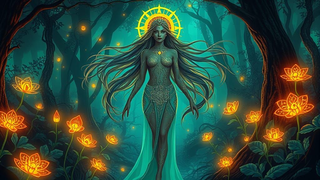 This image shows a mystical woman surrounded by glowing flora and fauna in a bioluminescent forest, with intricate patterns and symbols adorning her body. The scene is bathed in soft, ethereal light, creating a dreamlike atmosphere with vibrant colors and intricate details.