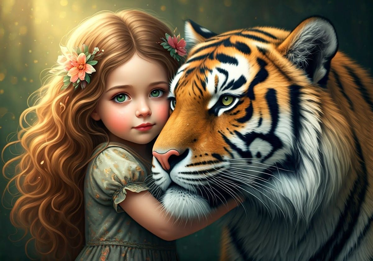 This captivating image shows a young girl embracing a majestic tiger, surrounded by a blend of soft pastel colors and photorealistic details, creating a sense of mystique and wonder