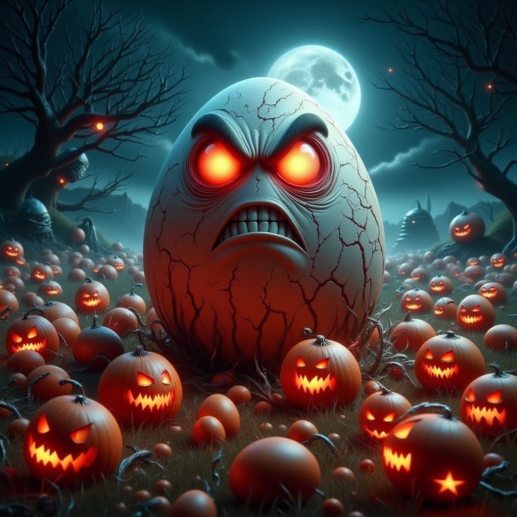 A photorealistic image shows a cracked, furious egg with glowing red eyes peeking from behind a giant pumpkin, disrupting a cinematic view of a harvest moon over a starry pumpkin patch.