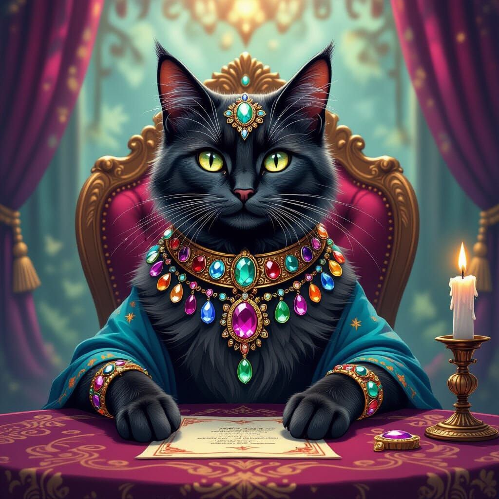 A captivating image of a fortune-telling cat adorned with jewelry. The feline sits at an elaborate velvet table, rendered with vibrant colors and swirling patterns in a surrealist style.