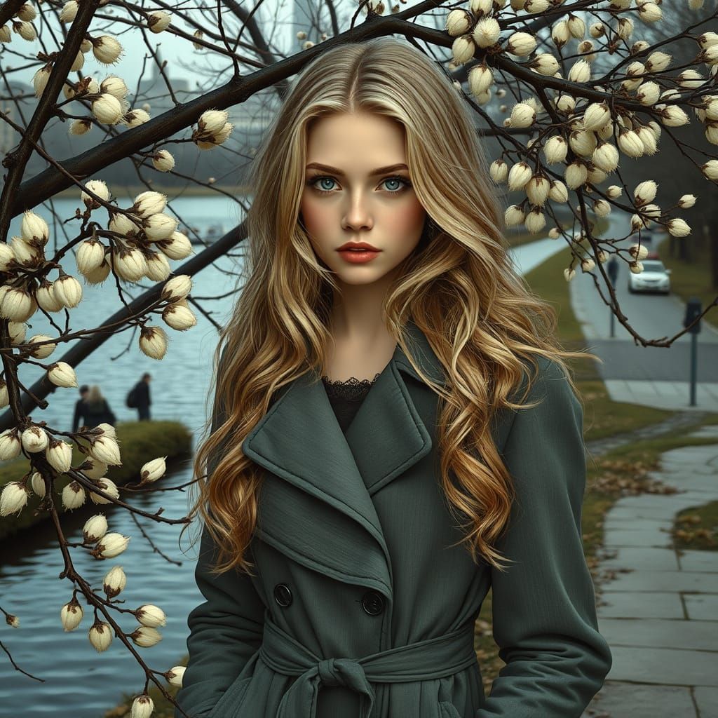 A portrait of a blonde woman in a belted trench coat, posing outdoors in spring. The image features art nouveau elements with atmospheric lighting, as seen in graphic novel art.