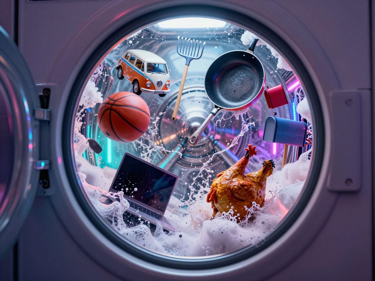 This image shows a vibrant, chaotic scene inside a cosmic washing machine. Various objects tumble in colorful suds, illuminated by dramatic neon lighting in a cyberpunk style.
