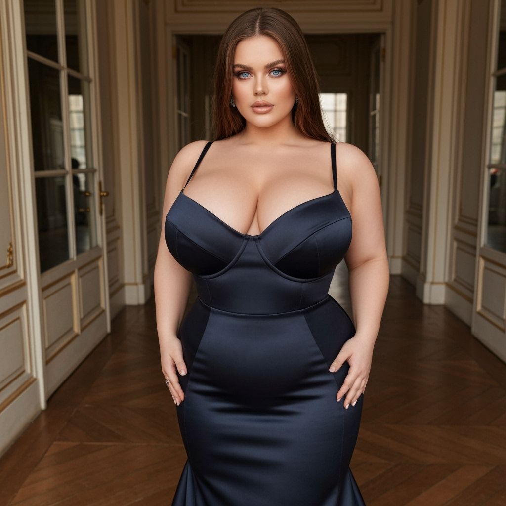 A photorealistic portrait of an extremely voluptuous young woman with striking blue eyes and long brown hair. She wears a daring satin gown in a Parisian ballroom, highlighting her exaggerated curves.
