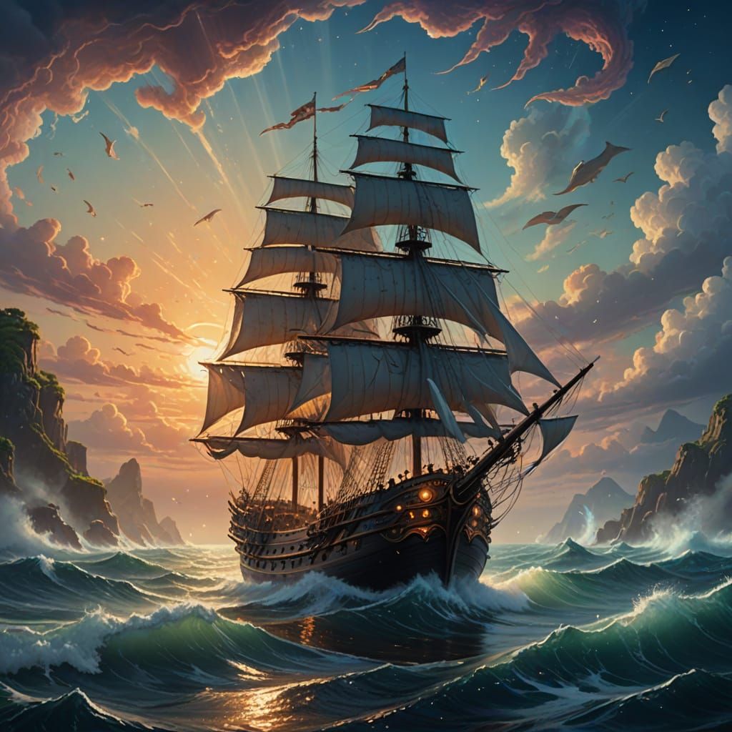 This image captures a majestic galleon sailing through misty waters, its intricate carvings and textures bathed in warm, golden light, evoking a dreamlike atmosphere of fantasy realism.