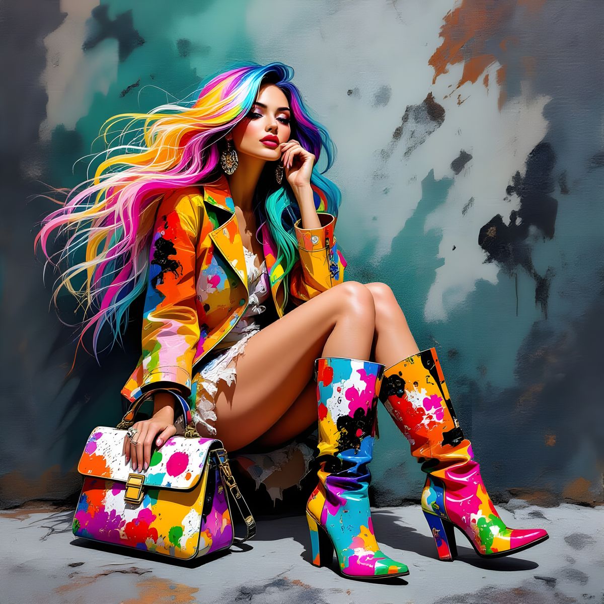 A vibrant woman with colorful hair and splash-patterned accessories poses against a graffiti wall. The image is rendered with bold brushstrokes and textures in a surreal style.